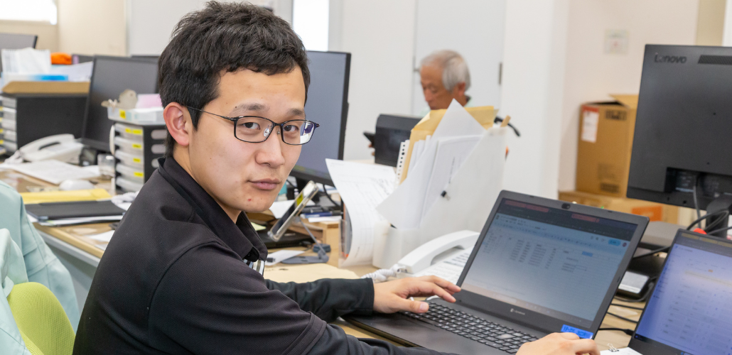 現在は管理課で、業務管理アプリの開発を中心に、会社のデジタル化を進める仕事をしています。小さいころから親しんできた英語のスキルや、大学で学んだ教育分野の知識も活かせていて、自分らしさを活かしながら働けることにやりがいを感じています。